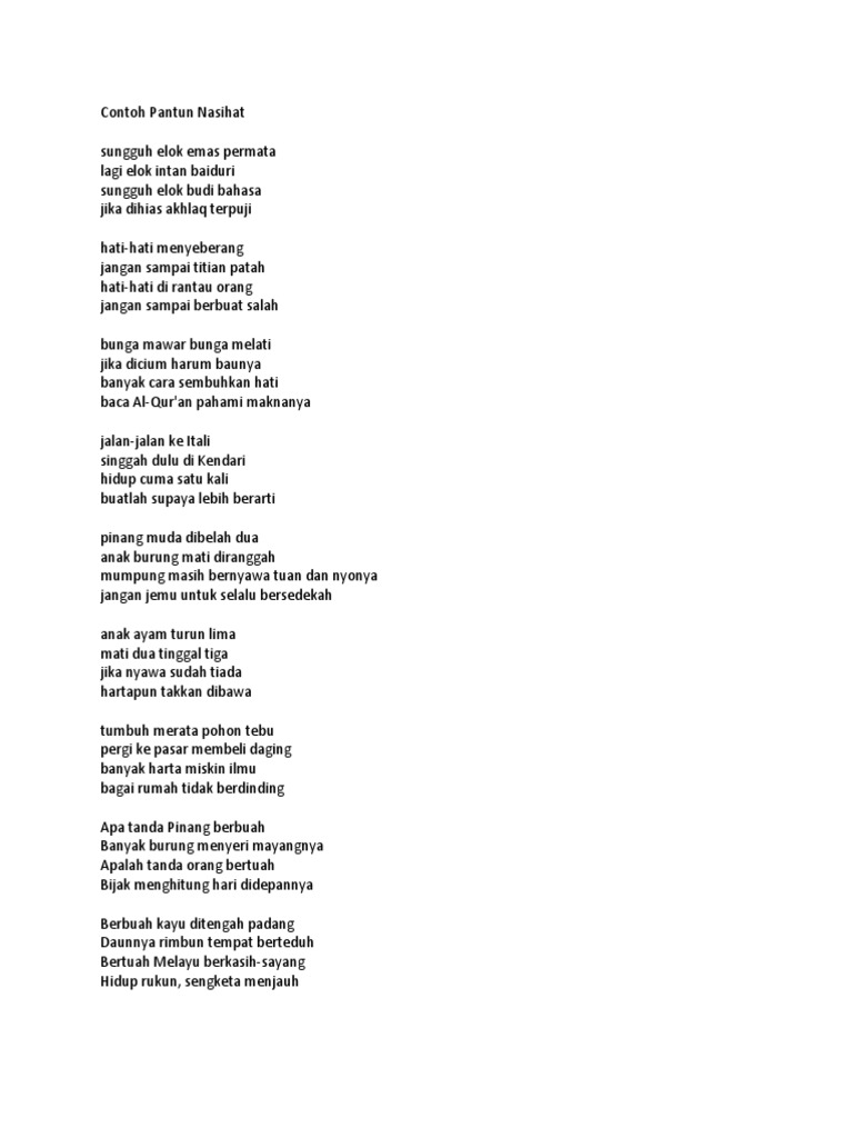4 baris dari pantun terdiri dari 2 baris sampiran dan 2 baris isi seperti pantun anak muda. Karena ungkapan perasaan dan pikiran tersebut disusun dengan kata kata yg sedemikian rupa sehingga menarik untk didengar atau dibaca. Pantu orangtua pantun adalah sebuah jenis puisi lama dalam bahasa nusantara. Perlu bakat dan kemampuan yang diasah. Contoh pantun nasehat pantun merupakan salah satu bentuk puisi lama yang berasal dari kata tuntun dari bahasa jawa yang artinya menyusun menuntun atau mengatur.