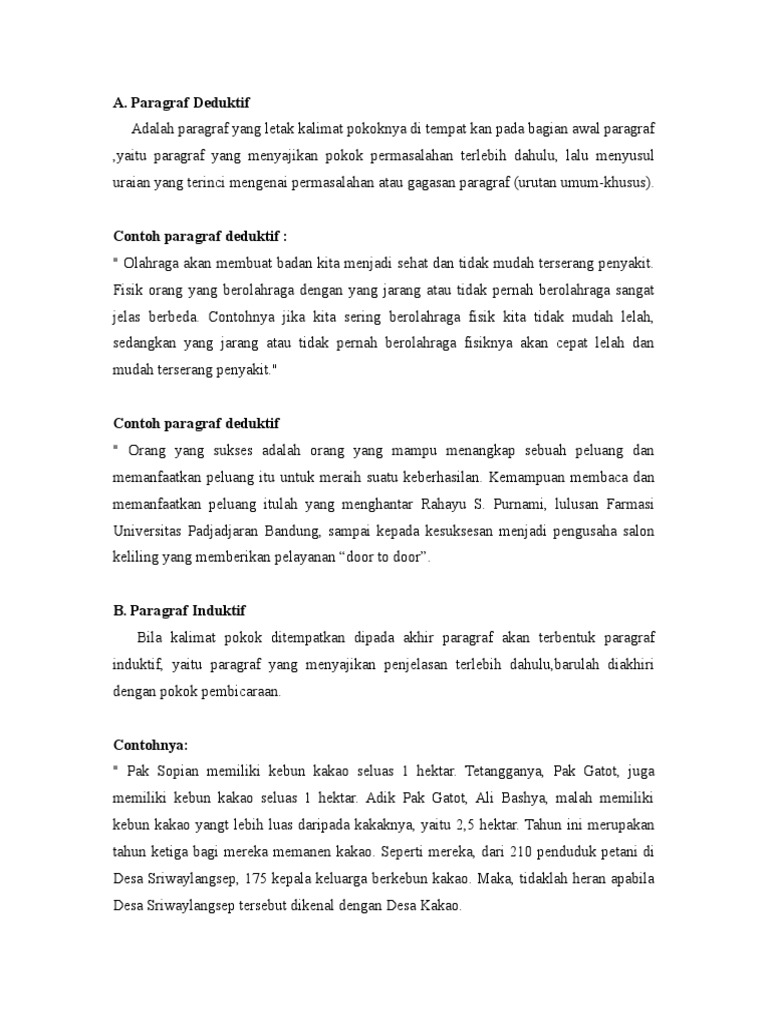 Paragraf deduktif pola paragraf deduktif alasan. Pada paragraf deduksi pola pengembangan umum khusus disebut dengan silogisme sedangkan pada paragraf induksi pola pengembangan khusus umum disebut generalisasi.