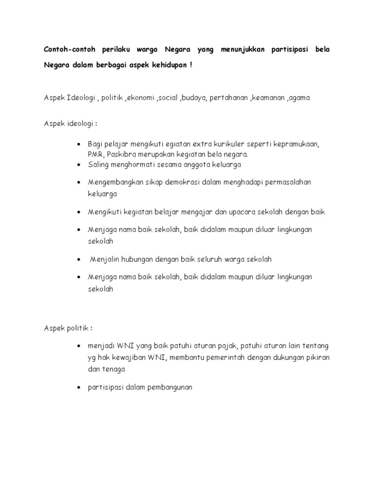 Berikut adalah contoh partisipasi dan perilaku politik yang sesuai dengan nilai dan norma yang berlaku. Semoga contoh contoh tersebut bisa terus diterapkan sehingga pembelajaran dan praktek tentang pendidikan politik dalam lingkup sekolah dapat membuahkan hasil yang diinginkan. Contoh dari partisipasi politik di lingkungan keluarga. Nah selanjutnya adalah contoh usaha bela negara yang dilakukan oleh kita semua di berbagai lingkungan mulai dari.