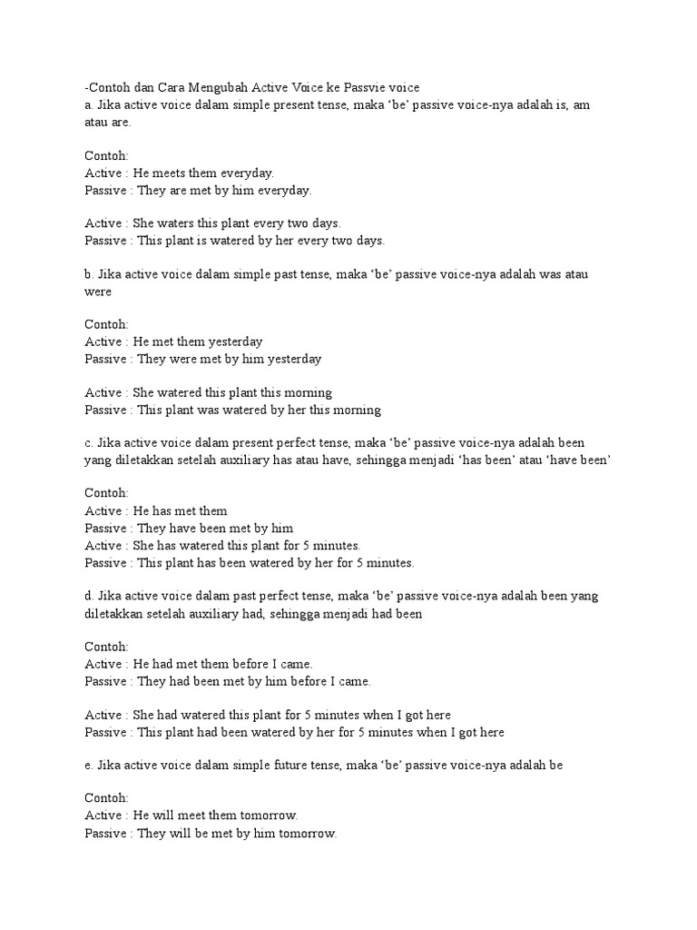 Choose the correct answer. Di bahasa indonesia kalimat pasif memiliki ciri tertentu yaitu biasanya diawali dengan awalan ter atau di. Dapur dibersihkan oleh ibu saya seminggu sekalipresent continuous. Subject pada passive voice merupakan object pada active voice. Bentuk passive voice bentuk passive voice dengan tenses. S verb 2 direct object.