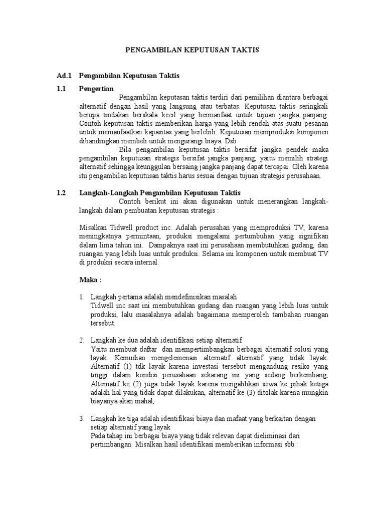Contoh pengambilan keputusan dalam perusahaan. Pak darwin adalah seorang menejer keuangan pada pt. Dari contoh kasus tersebut phil selaku ketua dewan direksi mengambilkeputusan dengan tipe keputusan tidak terprogram karena keputusan tersebut baru dan tidak tersusun. Dan tentunya dalam pengambilan keputusan keputusan keputusan tersebut harus dipikirkan secara matang terlebih dahulu agar tidak merugikan perusahaan tersebut dan pihak pihak yang terkait. Pekerjaan pada devisi keuangan mengharuskan pak darwin harus cermat dalam menginvestasikan serta mengolah keuangan pada pt. Sebelum membahas tentang strategi dan contoh kasus pengambilan keputusan dalam organisasi alangkah baiknya kita ketahui dulu apa itu pengambilan keputusan. Gaya pengambilan keputusan yang diterapkan adalah manajer mengambil keputusan sendiri berdasarkan masukan informasi yang diterima.
