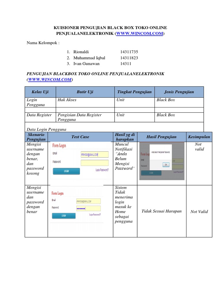 Contoh pengujian black box lengkap. Berikut ini adalah tabel pengujian black box berdasarkan sistem monitoring invientory control pada asuransi jiwa bersama ajb bumipuetra untuk fungsi menu data nasabah yaitu sebagai berikut. Contoh pengujian black box testing black box testing adalah pengujian dilakukan dengan cara memberikan sejumlah input pada program. Pengujian black box metode yang digunakan dalam pengujian alpha adalah metode black box yang fokus pada persyaratan fungsional dari perangkat lunak yang dibangun. Tabel 411 tabel pengujian black box pada menu data nasabah. Contoh pengujian black box metode implementasi. Perangkat lunak atau yang sering dikenal dengan sebutan software hanyalah satuan elemen dari sistem berbasis.