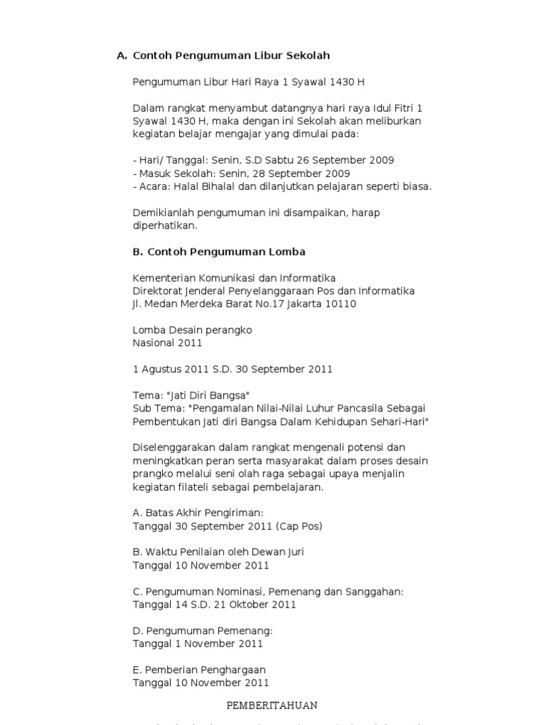 Ada banyak jenis pengumuman dan juga ruang lingkup penggunaan pengumuman. A written or spoken statement that tells people about something. Pengertian surat pengumuman adalah suatu media komunikasi tertulis yang berisikan informasi yang ditujukan bagi seluruh perusahaan instansi pemerintah yang bersifat internal. Surat pengumuman ini biasanya akan kita temui di lembaga pendidikan perusahaan instansi pemerintahan maupun organisasi. Dalam waktu tertentu perusahaan tentu akan memberlakukan hari libur. The collection that consisting of chosen picture and the best among others.