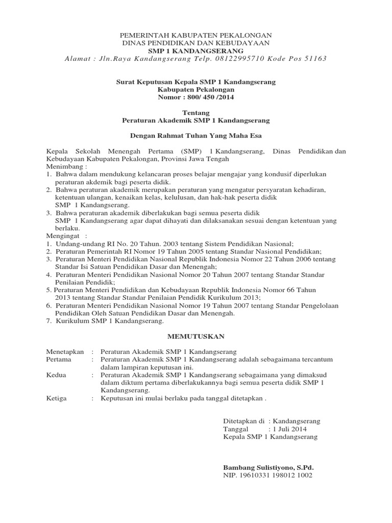 Contoh peraturan akademik smp. Contoh format jadwal pengawas un. Contoh peraturan akademik smpmts. Bahwa peraturan akademik merupakan peraturan yang mengatur persyaratan kehadiran ketentuan ulangan kenaikan kelas kelulusan dan hak hak peserta didik smp 1 kandangserang. Alasan pembatalan pengangkatan honorer k2 adalah pp. Kurikulum adalah seperangkat rencana dan pengaturan mengenai isi bahan kajian dan pelajaran serta cara penyampaian dan penilaiannya yang digunakan sebagai pedoman penyelenggaraan kegiatan belajar mengajar di sdn xxx. Contoh surat tugas pengambilan naskah un.
