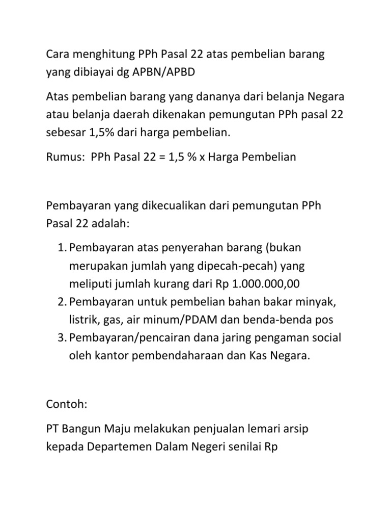 Contoh jurnal dan perhitungan pph pasal 22 dari pihak pemungut sebagaimana telah disinggung sebelumnya dari sudut pandang pemungut kewajiban perpajakan pph pasal 22 lebih bersifat administratif. Sedangkan pihak yang dipungut mendapat bukti pungut dan dapat dikreditkan pada akhir tahun di spt tahunan. Pt pertamina selaku produsen bahan bakar minyak gas dan pelumas menyerahkan bahan bakar minyak senilai rp300000000 tidak termasuk ppn kepada non spbu. Badan pemerintah termasuk bendahara pemerintah pada pada pemerintah pusat pemerintah daerah instansi atau lembaga pemerintah dan lembaga negara lainnya berkenaan dengan pembayaran atas penyerahan barang termasuk juga dalam pengertian bendahara adalah pemegang kas dan pejabat lain. Bendahara pemerintah dan kuasa pengguna anggaran kpa sebagai pemungut pajak pada pemerintah pusat pemerintah daerah instansi atau lembaga pemerintah dan lembaga lembaga negara lainnya. Perhitungan pph pasal 22.