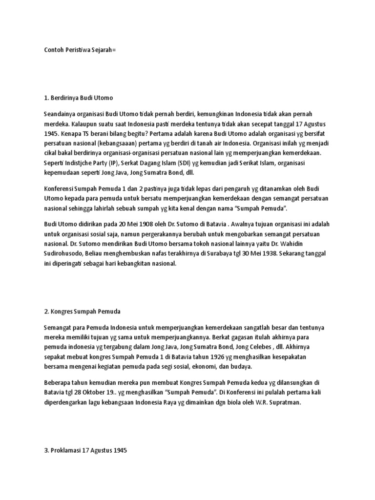 Contoh peristiwa sejarah indonesia. Pengertian kronologi fungsi konsep dan contoh kronologi dalam sejarah lengkap kronologi adalah catatan kejadian kejadian yang diurutkan sesuai dengan waktu terjadinya. Sejarah sebagai peristiwa dan contohnya bisa dilihat juga pada sejarah peristiwa rengasdengklok yaitu kejadian ketika soekarno dan hatta diculik oleh para golongan pemuda sebelum proklamasi kemerdekaanpara pemuda yang ingin menjauhkan soekarno dan hatta dari semua pengaruh pemerintah jepang mendesak agar kemerdekaan indonesia segera dilakukan tanpa pengaruh jepang. Namun untuk anda yang baru ingin mengetahui hal tersebut dibawah ini akan disebutkan tentang 10 peristiwa sejarah di indonesia yang sudah terkenal. Urutan peristiwa adalah rekaman peristiwa sejarah yang terjadi ini. Zaman protohistoris atau mula sejarah indonesia permulaan tarikh masehi abad ke 7 zaman sriwijaya syailendra abad 7 12. Kumpulan lengkap contoh teks cerita sejarah beserta strukturnya mulai dari orientasi sampai dengan urutan peristiwa dan kesimpulanya bisa kalian baca dalam artikel ini.