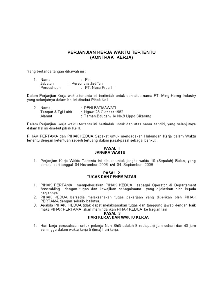 Contoh perjanjian kerja waktu tertentu. Contoh surat perjanjian kerja waktu tertentu masa percobaan 3 bulan 6 bulan 1 tahun. Pada hari ini tanggal 2010 di jakarta yang bertanda tangan di bawah ini. Secara hukum dan perundang undangan dikenal dua perjanjian kerja yaitu perjanjian kerja waktu tertentu pkwt dan perjanjian kerja waktu tidak tertentu pkwtt. Berdasarkan pasal 1 angka 2 keputusan menteri tenaga kerja dan transmigrasi republik indonesia nomor kep. Klausul ini untuk memenuhi syarat suatu hal tertentu seperti dalam syarat umum sahnya perjanjian yaitu obyeknya ditentuakan berdasarkan waktu pekerjaan atau selesainya pekerjaan. Pada hari ini senin tanggal dua puluh sembilan 29 bulan april 04 tahun dua ribu tiga belas 2013 telah dibuat dan disepakati perjanjian kerja antara.