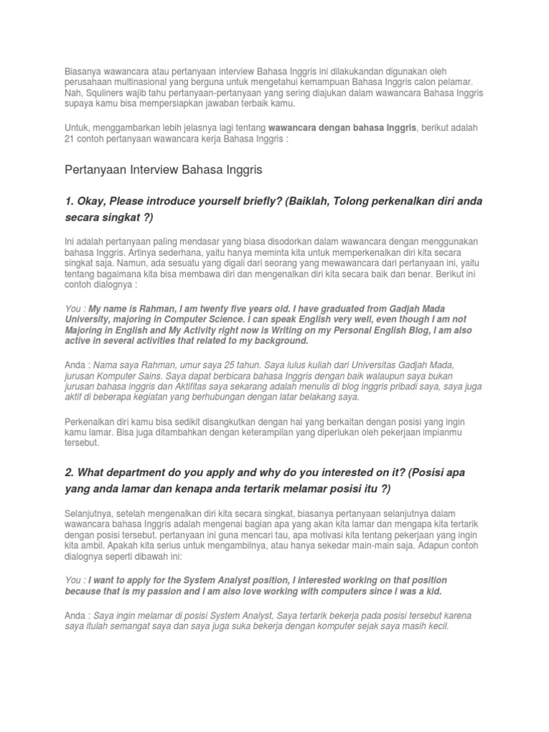 Contoh perkenalan diri dalam bahasa inggris saat wawancara kerja. Sobat pembaca pada posting kali ini saya akan share contoh percakapan interview wawancara kerja dalam bahasa inggrisinterview atau wawancara kerja dalam bahasa inggris biasa didapat jika perusahaan memberi persyaratan pelamar harus bisa berbahasa inggris atau pelamar sendiri yang menerangkan bahwa ia menguasai bahasa bahasa inggris. Contoh teks perkenalan diri dalam bahasa inggris beserta artinya terbaru oke buat sahabat sbi yang super. Jika anda mendapatkan panggilan interview yang mewajibkan anda memiliki kemampuan berbahasa inggris aktif anda harus bangga karena mungkin itu adalah perusahaan multinasional. Buat teman teman yang. Contoh dialog interview kerja dalam bahasa inggris interview kerja adalah salah satu tahap yang paling menegangkan bagi sebagian orang. Englishcoo perkenalan dalam bahasa inggris adalah kumpulan contoh cara memperkenalkan diri di berbagai situasi.