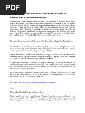 Karena bahasa inggris dikenal sebagai salah satu bahasa global yang digunakan mayoritas orang di dunia kemampuan berbahasa inggris menjadi sangat penting. Contoh teks perkenalan diri dalam bahasa inggris beserta artinya terbaru oke buat sahabat sbi yang super. I used to be a teacher assistant for a year and also a head of student organization for a year. I am 20 years old. Setiap tahun ajaran baru kadang kala kita mendapatkan kelas baru teman baru. My father is a teacher and my mother is a housewife.