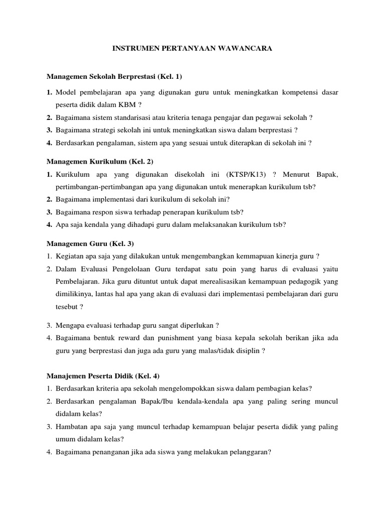 Guru sd smp sma contoh wawancara siswa berprestasi sd. Contoh format wawancara guru dan siswa berkas edukasi contoh instrumen wawancara untuk siswa smp ulasan contoh format wawancara guru dan siswa contoh file berikut ini adalah kumpulan dari berbagi sumber tentang contoh format wawancara guru dan siswa yang bisa bapak ibu gunakan dan diunduh secara gratis dengan menekan tombol download biru dibawah ini. Contoh pertanyaan dan jawaban wawancara dengan guru tentang penggunaan model pembelajaran di kelas ini merupakan hasil wawancaraku dengan seorang guru disalah satu sekolah di kabupaten simalungun di daerah tempat tinggalku. Contoh format pedoman wawancara penelitian skripsi adalah pokok pembahasan materi skripsi dan tugas akhir yang akan dijelaskan dengan lengkap dan detail pada materi belajar berikut ini. Pada intinya peningkatan kompetensi di sekolah lain berkaitan dengan bagaimana keunggulan itu dicapai dan bagaimana langkah langkah pencapaiannya kendala hambatan tantangan dan kesulitan yang. Instrumen wawancara dengan kepala sekolah dan guru di sekolah magang 2 ini merupakan salah satu kegiatan on the job learning untuk mengetahui peningkatan kompetensi berdasarkan akpk di sekolah lain.