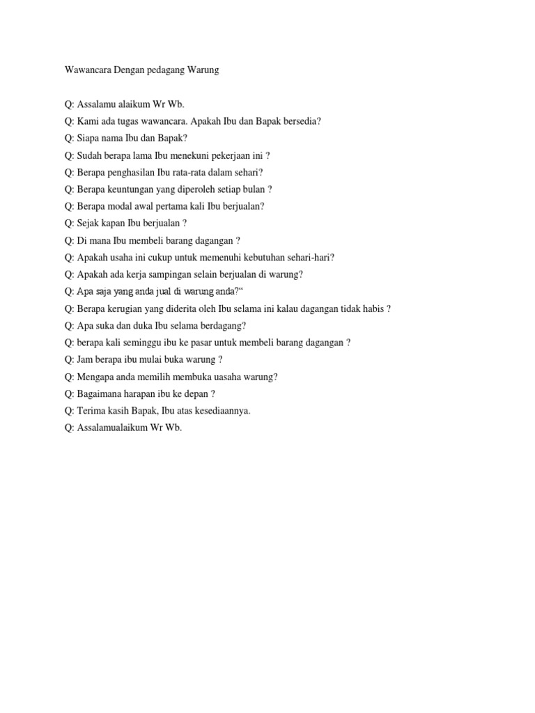 Di bulan pertama belum mendapatkan keuntungan minus. Demikian contoh hasil wawancara dengan salah seorang tukang atau pedagang makanan cilok semoga bisa bermanfaat sekedar untuk bahan referensi pertanyaan apa saja yang dapat kita pertanyakan kepada salah seorang pedagang. Wawancara dengan pengusaha warung nama. Ini sangat bermanfaat untuk syaterimakasih. Berikut ini adalah wawancara saya dengan seorang pedagang sembako yang bernama ibu dessy. Contoh wawancara dalam bahasa sunda dengan tukang cilok ini hasil referesi yang saya ambil dari tugas wawancara salah.