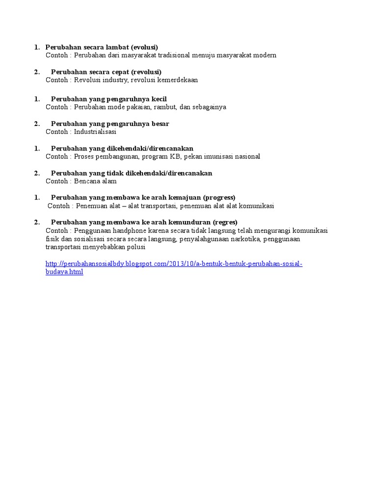 Pada umumnya tujuan perusahaan secara sengaja melakukan perubahan adalah untuk meningkatkan kemampuan perusahaan untuk beraptasi dengan lingkungan luar disekeliling perusahaan dan untuk merubah prilaku karyawan. Bidang musik tentu menjadi contoh perubahan sosial budaya juga. Perubahan bentuk ini adalah perubahan perubahan yang diperkirakan atau sudah direncanakan terlebih dahulu oleh pihak pihak yang akan melakukan perubahan di masyarakat. Penggunaan e book secara menyeluruh ini mèrupakan alah satu program unggulan pemerintah pusat yang tentunya diharapkan dapat mempermudah peserta didik untuk memahami materi pelajaran yang di dapatkan disekolah. Contoh lain untuk mengurangi pertumbuhan jumlah penduduk pemerintah mengadakan program keluarga berencana kb. Contoh perubahan sosial yang direncanakan contoh perubahan yang direncanakan adalah penggunaan e book elektronik buku sebagai pengganti buku buku pelajaran yang ada di sekolah.