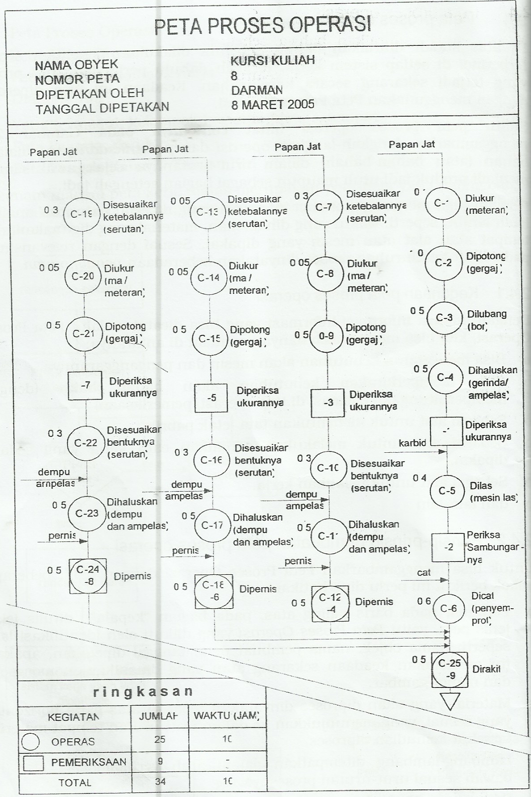 Waktu yang dihabiskan material yang digunakan dan tempat atau alat mesin yang dipakai. Sebagai konsekuensinya peta aliran proses tidak bisa digunakan untuk menggambarkan proses perakitan secara keseluruhan. Pengkuran kayupengukuran kayu terbagi menjadi dua lapisukuran kayu luar dan dalamukuran kayu luar yaitu 235 cm x 22 cm dengan ketebalan 6 mm dua buah. Menurut sutalaksana 2006 peta proses operasi merupakan suatu diagram yang menggambarkan langkah langkah proses yang akan dialami bahan bahan baku mengenai urutan urutan operasi dan pemeriksaan dari tahap awal sampai menjadi produk jadi atau komponen dan memuat informasi informasi yang diperlukan untuk menganalisis lebih lanjut seperti waktu material tempat alat dan mesin yang digunakan. Mulai dari perakitan pemasangan bagian dan lain lain. Contoh peta proses operasi.