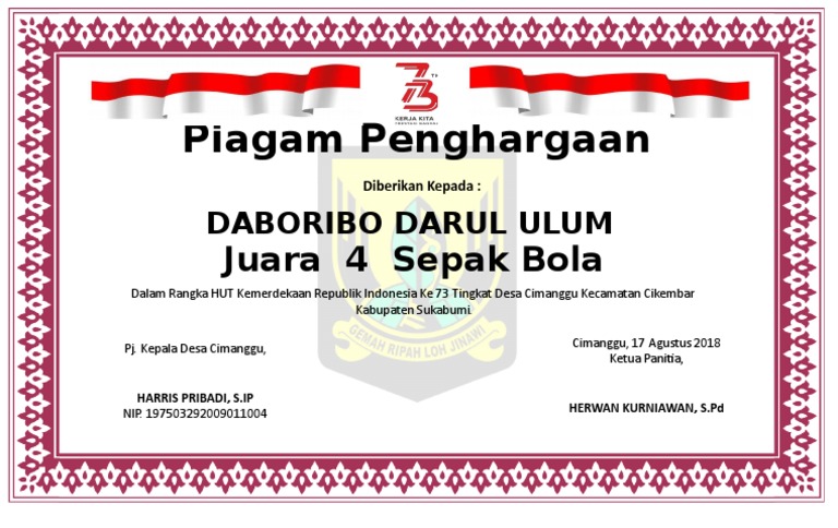 Contoh piagam penghargaan lomba 17 agustus. Bertempat di halaman kantor bupati pada malam 17 agustus resepsi dan syukuran hari kemerdekaan hut ke 73 bupati lingga menyerahkan piagam penghargaan pemenang lomba desa kelurahan tahun 2018. Berikut ini contoh desain piagam penghargaan juara lomba pada peringatan maulid nabi muhammad saw. Contoh piagam penghargaan juara lomba gerak jalan siswa. Kop hut ri ke 71. Seperti yang telah diketahui bahwa ada banyak macam kegiatan yang dilaksanakan untuk memperingati hari 17 agustus ini misalnya kegiatan lomba. Penghargaan biasanya diberikan dalam bentuk medali piala gelar sertifikat plaket atau pita.