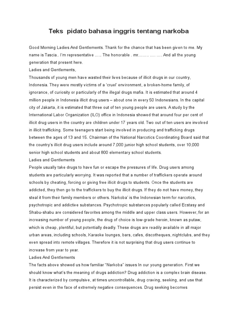 Pidato bahasa inggris tentang narkoba as we most already knew drug is a kind of medicine that is being misapplied. Contoh pidato ini bisa dipakai oleh anak sekolah baik anak sd smp sma kuliah bahkan untuk pekerja sekalipun. Oleh karena itu kita harus menghindarinya dengan segala cara. Nah berikut adalah teks pidato tentang narkoba dalam bahasa inggris dan indonesia. Entah dalam rangka tugas sekolah maupun sebagai pembelajaran pribadi. Text 1 assalamualakum wr wb best wishes.