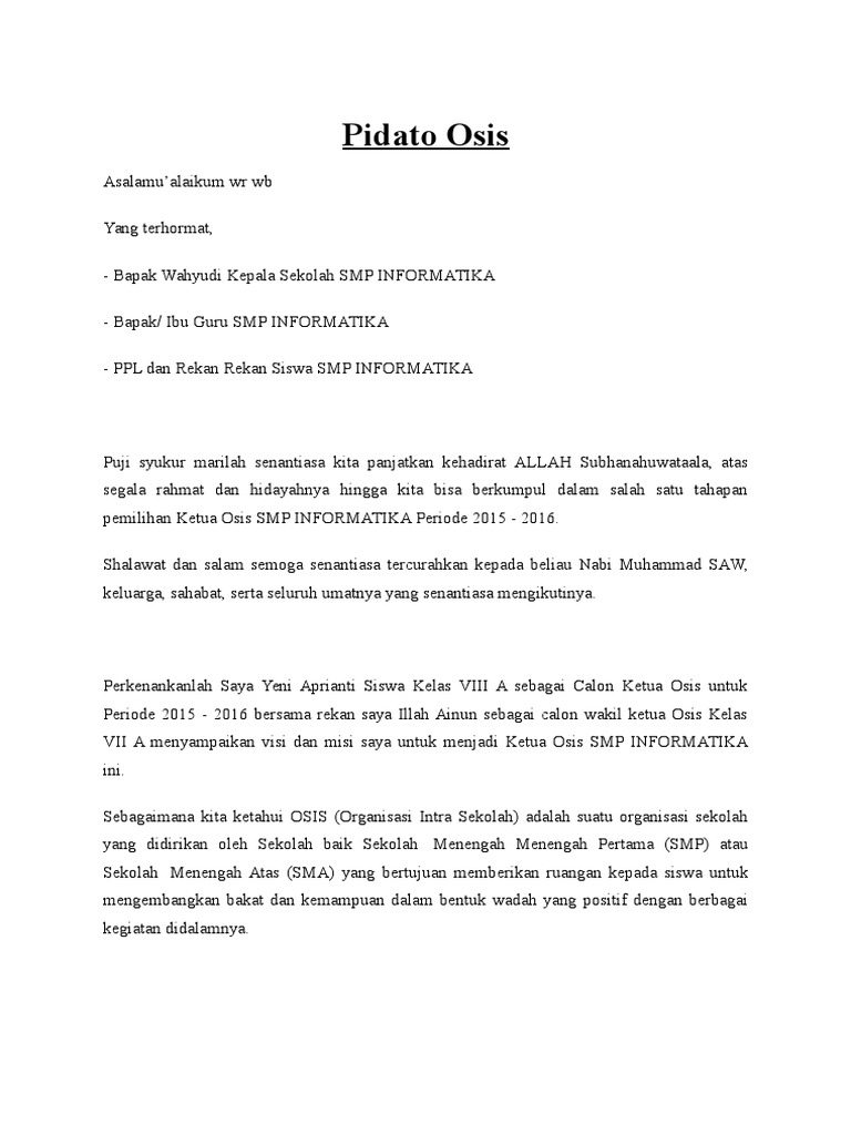 Perkenalkan nama saya muhammad ilham akbar dari kelas viii a sebagai calon ketua osis smpn 3 marabahan periode tahun 2012 2013. Contoh pidato singkat calon osis. Peduli lingkungan dengan melaksanakan bakti sosial secara berkala. Pidato calon ketua osis. Seandainya nanti saya terpilih menjadi ketua osis saya akan memberikan yang terbaik semaksimal kemampuan saya. Contoh pidato visi dan misi calon ketua osis pidato adalah suatu kegiatan menyampaikan gagasan ide dan pendapat kepada khalayak umum.