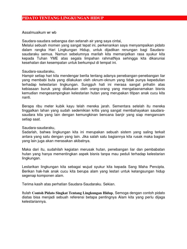 Dalam kesempatan kali ini mamikos akan memberikan contoh naskah pidato tentang kebersihan lingkungan atau contoh pidato tema lingkungan. Dalam hal ini manusia mempunyai pengaruh yang paling besar terhadap lingkungan. Apa itu pidati lingkungan hal ini merupakan pola lingkungan hidup yang bisa kamu jadikan sebuah referensi dalam pembuatan naskah pada hendak tampil membawakan sebuah pidato di depan umum terutama pada lingkungan sekitar. Jadikan contoh naskah pidato tersebut sebagai bahan acuan untuk sobat sekain dalam membuat naskah pidato sobat sendiri. 903 am herlambang priyo trapsilo no comments pidato lingkungan hidup.