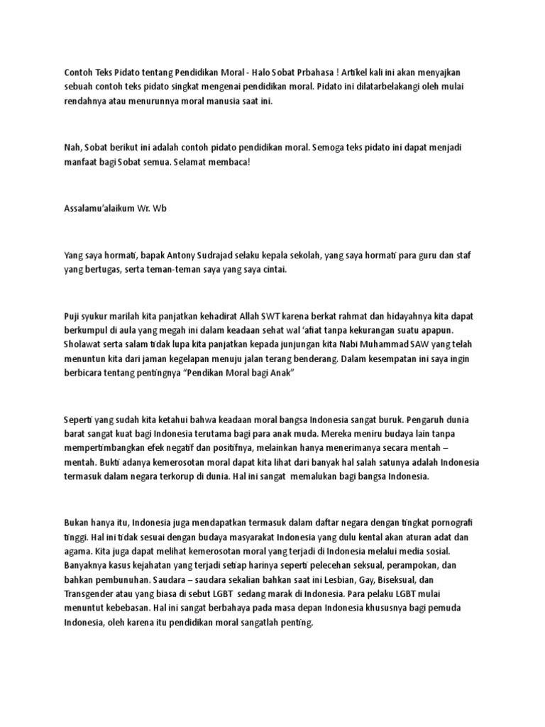 Keluarga merupakan jalur pendidikan pertama dalam pengembangan pendidikan moral bagi anak. Hal tersebut dibuktikan dengan banyaknya kasus yang mencerminkan kebutaan moral khususnya kaum pelajar misalnya aksi tawuran dan kriminalisme pelajar. Pidato yang baik dapat memberikan kesan positif bagi mereka yang mendengarkan pidato. Contoh pidato pendidikan moral pidato adalah salah satu teori perjalanan dalam bahasa indonesia. 4 contoh pidato pendidikan nasional moral sekolah dan karakter utari ida oesman 19092017 28082018 pidato pendidikan pendidikan merupakan hal yang sangat penting dalam kehidupan manusia. Marilah kita panjatkan puja dan puji syukur kepada allah saw berkat taufiq dan hidayahnya jualah kita dapat berkumpul pada pagi hari yang cerah ini serta masih diberikan kekuatan iman islam dan ihsan dan kesehatan.