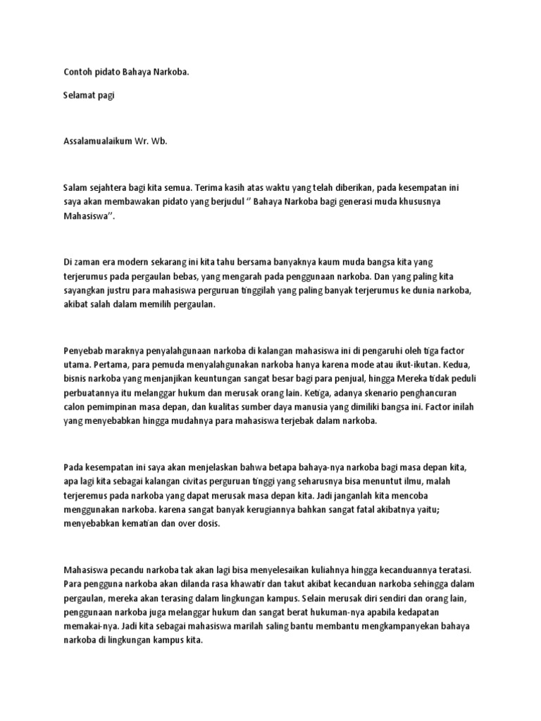 Contoh pidato tentang bahaya narkoba. Maka dari itu marilah para putra dan putri bangsa. Seperti kita ketahui penyalahgunaan narkoba di indonesia merupakan masalah serius. Banyak generasi muda kita. Dan atas perhatiannya saya ucapkan banyak terima kasih. Pidato tentang narkoba pidato tentang narkoba adalah pidato yang sebagian isinya menyampaikan tentang narkotika. Janganlah sekali kali kita mencoba untuk menggunakan narkoba karena jika kita mencobanya maka kita akan rugi seumur hidup kita.