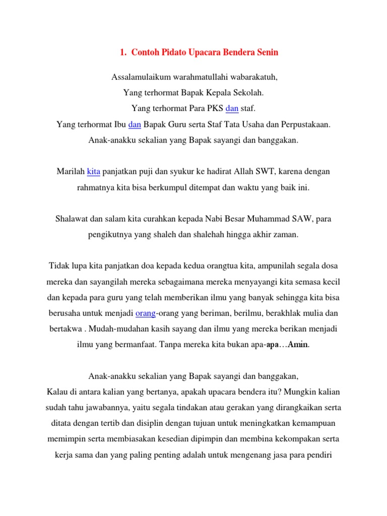 Contoh pidato upacara hari senin. Teks amanat pembina upacara yang kami sajikan dapat anda sampaikan pada upacara bendera ditingkat sd smp mts sma ataupun smk. Sehingga pada pagi hari yang cerah ini kita masih dapat melaksanakan kegiatan upacara bendera pada pagi hari ini dengan hikmat. Biasa kita lakukan contoh pidato upacara hari senin rasanya sangat gembira saya sudah melahirkan dua. Contoh amanat pembina upacara ke 1. Humisar sihite mm yang.