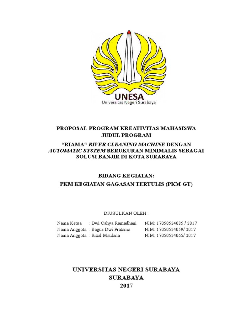 I program kreativitas mahasiswa desa mandiri energi berbasis pembangkit listrik tenaga mikrohidro terpadu untuk pelosok desa di indonesia guna menunjang ketahanan energi nasional bidang kegiatan. Contoh proposal pkm gt usulan program kreativitas mahasiswa. Museum jamu sebagai pariwisata berbasis pengembangan keunggulan lokal kabupaten sukoharjo. I program kreativitas mahasiswa otomatisasi pengambilan size visibility rich files dan scholar dari website sebagai alat ukur indikator webometrics bidang kegiatan. 101910101068 angkatan 2010 arif darmawan pribadi 111910301056 angkatan 2011 dwi abdi gusti ginanjar 121910101004 angkatan 2012. Contoh pkm gt 1.