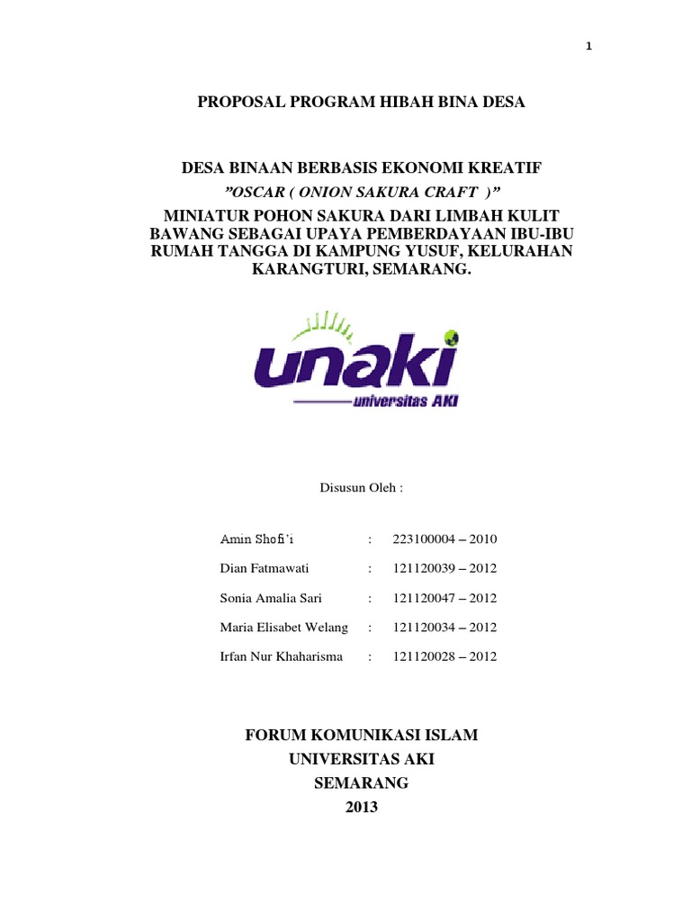 Pertemuan dengan masyarakat desa ulusena untuk mensosialisasikan kegiatan phbd 2014 kemudian dilakukan pelatihan terutama masyarakat berstatus job searcher ditambah para petani di desa ulusena. Sebagai tindak lanjut surat kami nomor. 291b33km2017 tanggal 8 februari 2017 perihal tawaran program hibah bina desa phbd 2017 direktorat kemahasiswaan direktorat jenderal pembelajaran dan kemahasiswaan telah menerima sebanyak 2891 praproposal. Proposal program hibah bina desa desa binaan berbasis ekonomi kreatif oscar onion sakura craft miniatur pohon sakura dari limbah kulit bawang sebagai upaya pemberdayaan ibu ibu rumah tangga di kampung yusuf kelurahan karangturi semarang. Proposal program hibah bina desadocx. Diajukan oleh ketua pengusul diketahui oleh pemimpin organisasi pengusul.