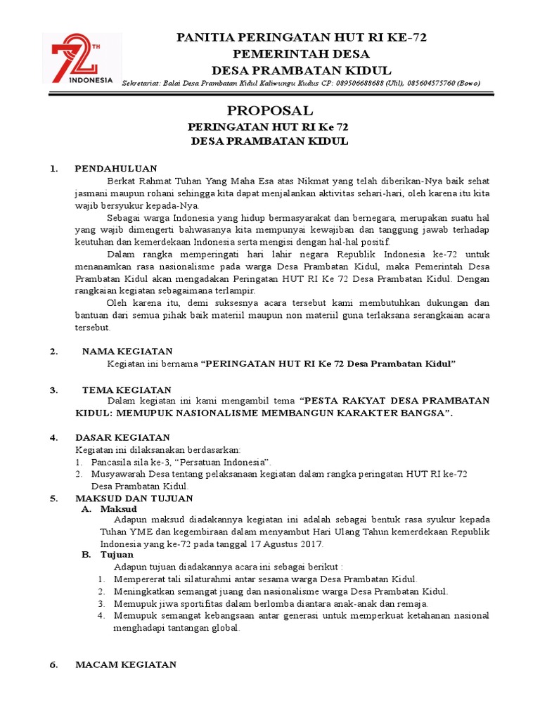 Contoh proposal 17 agustus di desa. Contoh proposal 17 agustus di desa baik tingkat rt atau dusun selengkapnya. Salah satu acara yang paling sering di adakan di setiap desa yaitu perlombaan untuk anak anak namun dalam perkembangannya. Pdf contoh proposal 17 agustus yang baik dan benar bulan agustus adalah bulan di mana seluruh rakyat indonesia akan memperingati hari kemerdekaan indonesia. Demikian contoh proposal kegiatan 17 agustus untuk di sekolah contoh proposal kegiatan 17 agustus untuk karang taruna dan contoh proposal kegiatan 17 agustus. Momen yang ditunggu tunggu oleh seluruh rakyat di tanah air dalam mengenang jasa para pahlawan yang telah gugur. Contoh proposal 17 agustus karang taruna desa pengajuan dana untuk contoh proposal 17 agustus karang taruna desa anda bisa mencontek contoh proposal hut ri 17 agustus untuk sekolah di atas tinggal diedit jenis perlombaan waktu tempat dan kepanitiannya saja.
