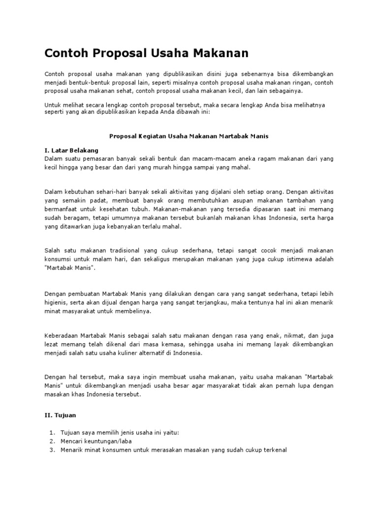 Sholawat beserta salam mari kita hadiahkan. Usaha ini ditempatkan di tempat tempat strategis di sekitar kampus. Dalam bidang kuliner ini untuk memudahkan konsumen mengingat dan. Banyak sekali makanan tradisional khas indonesia yang bisa dijadikan usaha. Untuk mendapatkan dokumen lengkap contoh proposal usaha makanan. Contoh proposal usaha makanan buat anda yang mempunyai usaha upa saja apa kah usaha kecil atau usaha besar maka anda bisa membuat proposal yang saat ini kami sampaikan di blog ini sehingga anda bisa mencontoh proposal ini supaya anda bisa lancar dan sukses di bidang usaha anda nantinya.