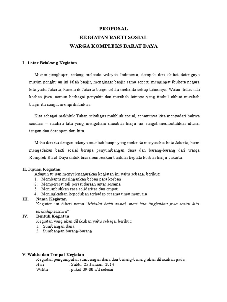 Demikian proposal ini kami buat diharapkan kegiatan bakti sosial untuk pemulung ini dapat menjadi wadah kepedulian sesama dan menumbuhkan rasa empati antar makhluk sosial. Dalam rangka memperingati hari ulang tahun ri yang ke 61 semua sekolah mengikuti karnaval yang diadakan setahun sekali oleh pemkot purwodadi. Dalam praktiknya anda akan memerlukan berbagai contoh proposal untuk disimpan dan sewaktu sewaktu dapat digunakan saat diperlukan. Proposal lazimnya dikenal sebagai sebuah dokumen yang berisi rencana kegiatan yang terancang secara sistematis dan terperinci. Bakti sosial di desa tanggungharjo. Atas perhatian dan partisipasinya dalam kegiatan ini kami ucapkan terima kasih.
