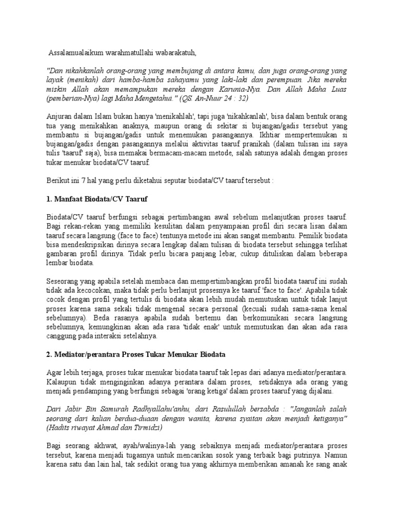 Tapi cv pribadi saya tetap nggak bisa saya. Untuk memudahkan dalam membuat cv taaruf akhwat ukhti dapat mengunduh contoh cv taaruf yang dibuat oleh temanshalihcom bagian bagiannya dapat disesuaikan dirubah sesuai dengan kebutuhan masing masing individu baik ikhwan atau akhwat. Namun bagi umat islam cv taaruf merupakan salah satu alat terbaik untuk mengenal atau memperkenalkan diri kepada calon pendamping hidup.