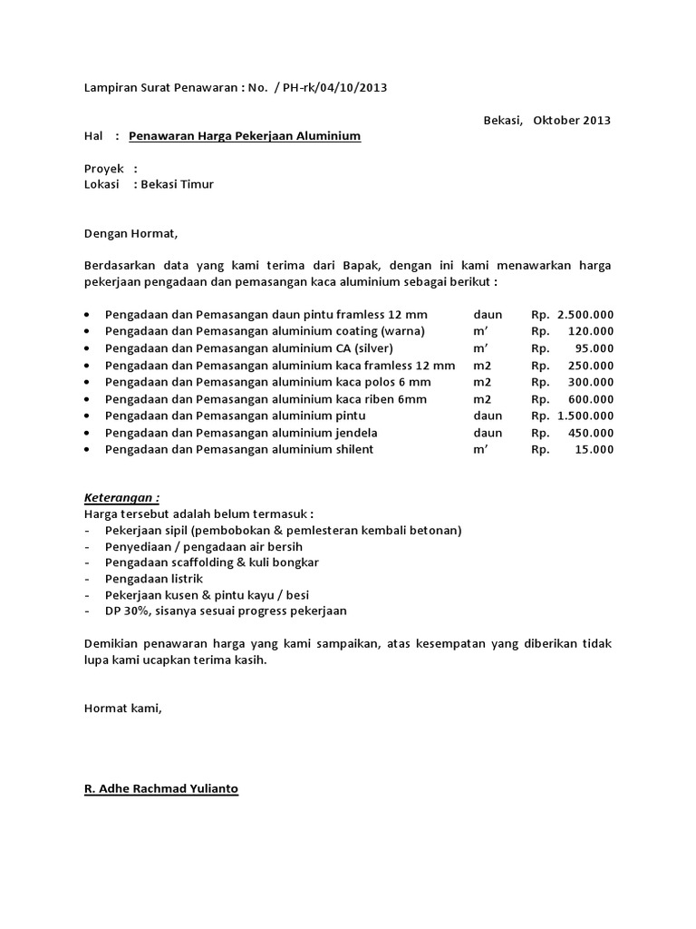 Contoh proposal penawaran proyek. Contoh surat penawaran proyek terbaru dan lengkap file word. No item volume satuan harga satuan harga total 1 kanopi 20 m2 rp 200000 rp 4000000 1 pagar 15 m2 rp 180000 rp 2700000 1 pintu rolling. Contoh surat penawaran menjadi seorang pengusaha atau bisnisman pasti akan mengenal salah satu jenis surat resmi ini. Contoh surat penawaran pekerjaan proyek january 1 2016 2 december 2. Proposal ini menjadi satu kesatuan dengan surat penawaran barang. Jenis surat ini tergolong masih merupakan salah satu jenis surat yang masih relevan untuk digunakan pada saat sekarang ini.