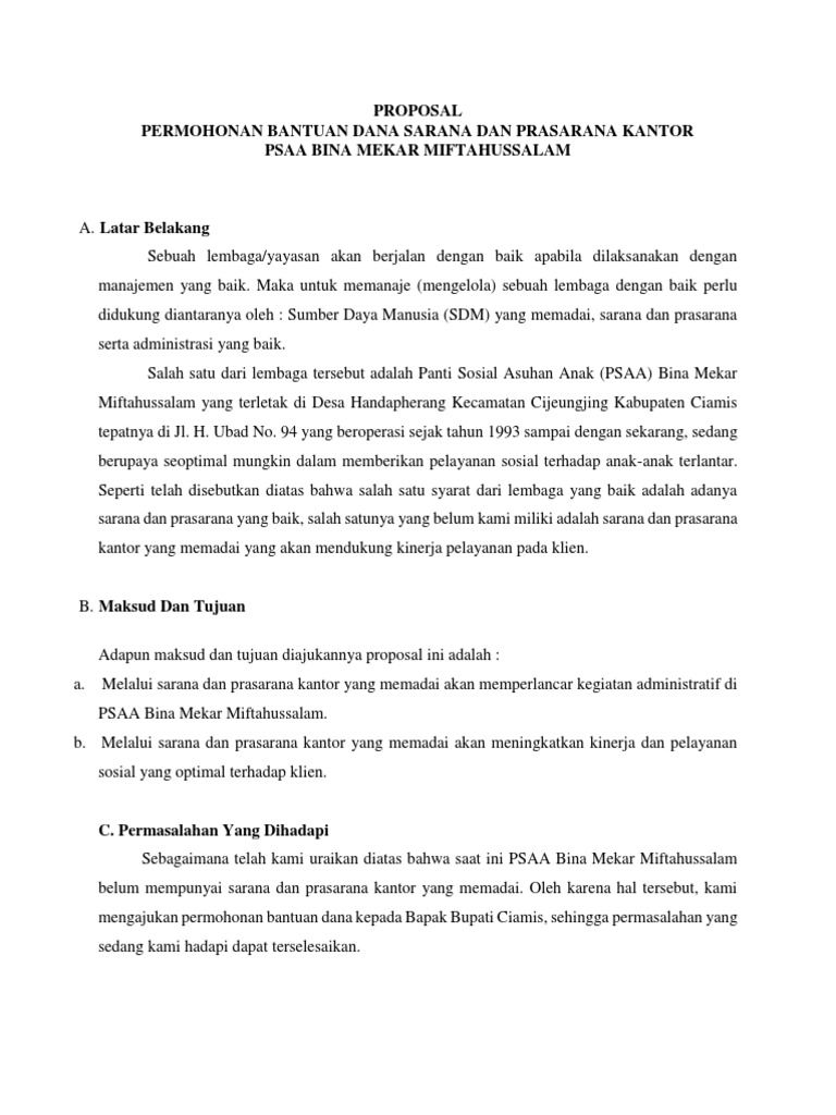 Ruang belajar kelas ruang perpustakaan. Biaya untuk pelaksanaan pengadaan sarana dan prasarana kantor psaa bina mekar miftahussalam dibebankan pada anggaran yang bersumber dari apbd tingkat ii kabupaten ciamis yang besarnya telah di tentukan apabila ada kekurangan biaya dalam pelaksanaan dan biaya untuk panitia di bebankan pada anggaran panti dari sumber luar dan apbd. Contoh proposal bantuan sarana dan prasarana lapangan tenis. Karena di lingkungan rt03 dan rt07 semenjak terjadinya bencana gempa bumi pada tahun 2006 sudah tidak ada tempat yang memadai sebagai. Pe ngadaan peralatan kantor. Penyimpanan sarana dan prasarana kantor adalah kegiatan yang dilakukan oleh satuan kerja atau petugas gudang untuk menampung hasil pengadaan barang atau bahan kantor baik berasal dari pembelian instansi lain atau diperoleh dari bantuan.