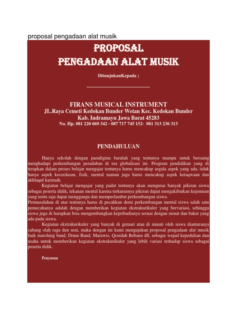 Contoh proposal pengadaan alat hadroh ditujukan kepada bupati bantul pada kesempatan kali ini kami akan memberikan contoh dalam pembuatan proposal pengadaan alat hadroh yang ditujukan kepada bupati bantul untuk perihal dalam permohonan bantuan dana. Contoh proposal pengadaan alat musik.
