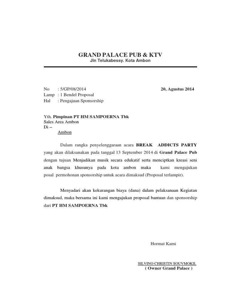 Contoh proposal permohonan sponsor. Contoh proposal kegiatan sekolah untuk pentas seni. Dikatakan suatu komunitas yang baik apabila mempunyai pemikiran serta moral yang baik. Hal itu akan membuat donatur dan pihak sponsor lebih semangat untuk membuka proposal kamu. Contoh proposal sponsorship untuk permohonan bantuan dana lengkap dengan penjelasannya. Inilah contoh cover proposal kegiatan yang menarik. Bentuk sponsor yang diberikan pun tidak berarti harus dalam bentuk uang saja tetapi bisa juga dalam bentuk barang ataupun tenaga.