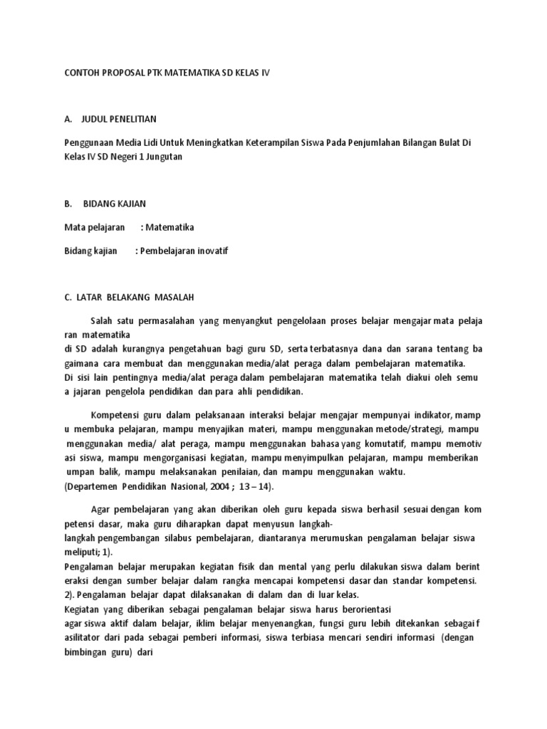 Ikut share dvd kumpulan penelitian tindakan kelas berisi 250 ptk lengkap plus lampiran dengan berbagai macam model dan metode pembelajaran yang bisa digunakan sebagai referensi dalam pembuatan karya ilmiah dan juga sebagai referensi untuk kenaikan pangkat bapakibu guru tidak usah bingung dengan teori teori model dan metode pembelajaran semua tingkat ada insya alloh sangat bermanfaat. Contoh pidato dalam lomba pmbks di sd 1 contoh proposal ptk 2 contoh ptk bahasa indonesia 1 contoh ptk ipa 1 contoh soal plpg 1 contoh soal ulangan akhir semester 1 contoh soal us potensi daerah agribisnis 1 hasil refleksi dan analisia 1 ipa kelas iv sd 1 jilbab bilan 1 jurnal belajar 1 koordinat 1 lagu layar tancap. Contoh proposal ptk sd kelas 4. Peningkatan hasil belajar matematika dengan pendekatan matematika realistic contoh penelitian tidakan kelas paud. Download contoh proposal ptk sd kelas 1 6 lengkap proposal ptk memang pada umumnya ditaklah jauh berbeda dengan proposal lainnya dimana pada dasarnya sebuah proposal ptk memiliki tiga struktur dan komponen bagian utama yaitu awal inti dan akhir dimana pada bagian awal terdapat halaman sampul halaman pengesahan dan daftar isi untuk bagian inti proposal ptk terdiri atas permasalahan. Setiap lembaga sekolah pasti mempunyai bidang studi pokok dalam kegiatan pembelajarannya guna meningkatkan pengetahuan dan keterampilan para siswa.