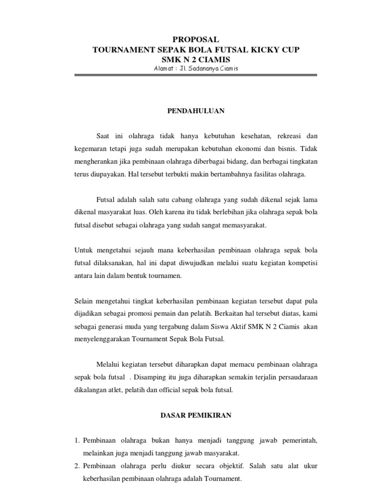 Semoga pelaksanaan turnamen antar rt kali ini dapat membina dan mengembangkan bakat olahraga sepak bola bagi para generasi muda khususnya kampung yudha karya jitu ini lebih maju dan dimanis. Contoh proposal turnamen sepakbola antar desa se kecamatan. Demikian proposal kegiatan ini disusun dan diajukan kepada pihak pihak terkait sebagai gambaran dan pedoman bagi pelaksanaan kegiatan turnamen sepak bola sangia cup kecamatan sape kabupaten bima dan semoga dapat menjadi pertimbangan dalam menjalin kerja sama. Contoh proposal turnamen sepak bola 1. Tawang kota tasikmalaya tahun 2013 2. Proposal sponsorship ini dimaksudkan sebagai pernyataan pengajuan kerjasama berupa bantuan dana kepada sebuah sponsor contohnya perusahaan atau bumn yang bersedia mendanai klub sepak bola tersebut dalam berkompetisi pada turnamen lokal tertentu yang akan diselenggarakan.