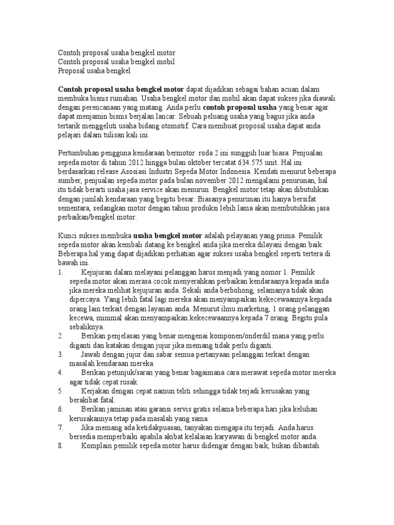 Lokasi usaha ini sangat strategis karena terletak jalan raya cukup ramai dan dekat dengan sebuah perumahan cukup besar yang sedang berkembang. Melnajutkan dari artikel. Fasilitas dan perlengkapan usaha yang diperlukan dalam membangun usaha ini adalah. Kondisi seperti inilah yang harus kita akan manfaatkan sebagai peluang usahausaha bengkel mobil memang menjanjikan. Demikian informasi yang membahas mengenai contoh proposal usaha bengkel sepeda motorsemoga informasi diatas dapat bermanfaat dan terima kasih sekali lagi sudah berkunjung di wwwmodifikasicoid jangan lupa untuk like comment dan share. Rencana bengkel mobil ini akan dibuka pada komunitas bengkel mobil dikota tersebut.