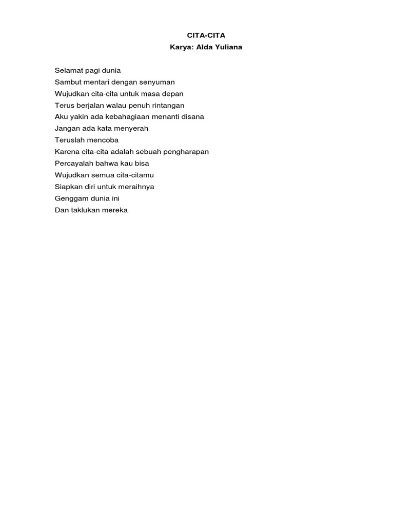 Deri lingga imajinasi meraih cita cita cita cita terselimut pe. Kali ini admin akan memberikan 7 contoh puisi tentang mimpi dan cita cita dalam bahasa inggris. Sahabat kbi pun bisa mengekspresikan nya dengan banyak hal melaui tempelan dinding atau dengan puisi dalam bahasa inggris seperti apa contoh pusi dengan bentuk mimpi dan harapan. Kata mutiara john lubbock. Kata kata dahsyat. Untuk lebih jelasnya tentang puisi yang mengulas akan cita cita disimak saja tiga puisi bertema cita cita dibawah ini.
