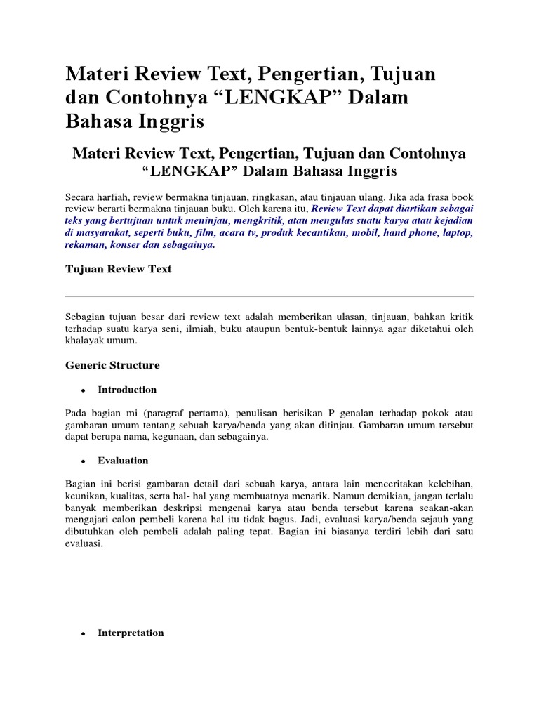 Kita dapat melihat review text dalam sebuah koran atau majalah. Oleh karena itu review text dapat diartikan sebagai teks yang bertujuan untuk meninjau mengkritik atau mengulas suatu karya atau kejadian di masyarakat seperti buku film acara tv produk kecantikan mobil hand phone laptop rekaman konser dan sebagainya.