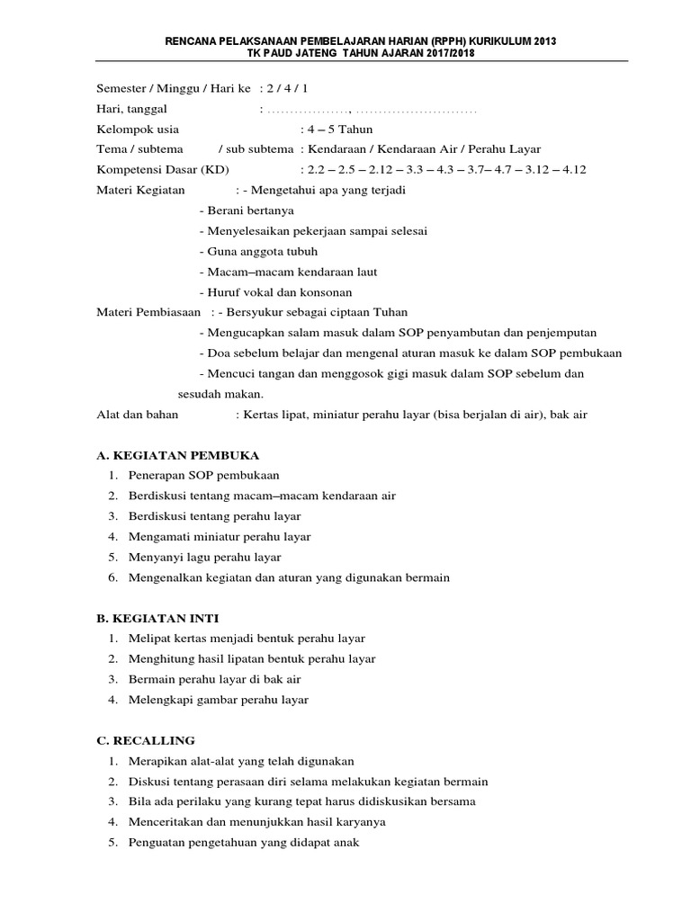 Kurikulum paud 2013 pada hakikatnya merupakan seperangkat rencana yang akan dilakukan selama proses pembelajaran sehingga mutlak diperlukan oleh setiap satuan pendidikan. Contoh rppm dan rpph dengan model pembelajaran area di tk kurikulum 2013. Rpph semester 1 paud tk a usia 5 6 tahun lengkap semua tema ini merupakan kumpulan rpph lengkap link paud yang sengaja dihimpun untuk satu semester agar memudahkan anda dalam menemukan rpph k13 paud semester i.