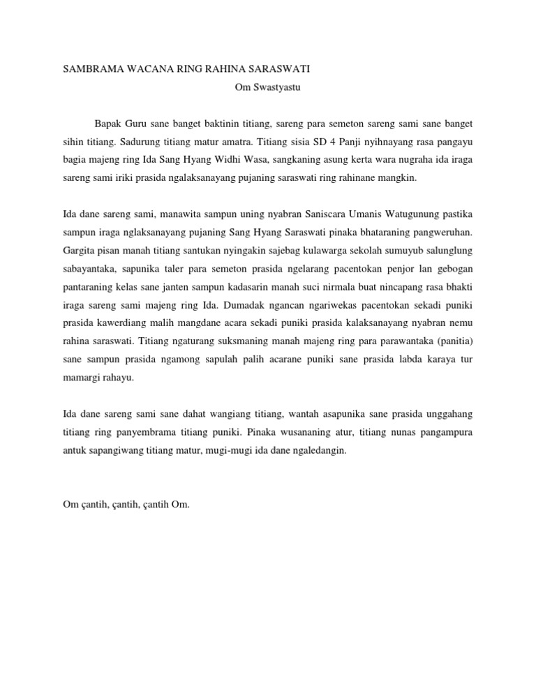 Sambrama wacana atau kata sambutan adalah elemen penting yang kerap kali disertakan dalam sebuah acara berikut adalah salah satu contoh sambrama wacana bahasa basi yang di buat guna melengkapi. Sadurung titiang ngelanturang atur pinih riin ngiring dumun ngaturang puja pangastuti majeng ring ida sang hyang widhi wasa duaning majanten sangkaning pasuecan ida parikrama rahina mangkin prasida mamargi antar tan kapialang majeng ring para manggala desa makadi bapak bendesa. Sambrama wacana ring rahina saraswati. Contoh darma wacana bahasa balisuksman rahina tumpek kandang suksman rahina tumpek kandang. Angayu bagia pisan aturang titiang majeng ring ida sang hyang widhi wasa utawi tuhan yang maha esa duaning asung kerta wara nugraha ida titiang prasida iriki jagi ngaturang sambrama wacana tur prasida iraga mapulpul iriki nyarengin indik pembukaan pesta kesenian bali pkb duk 9 september 2015. Yen ring contoh niki tiyang lebih ke.