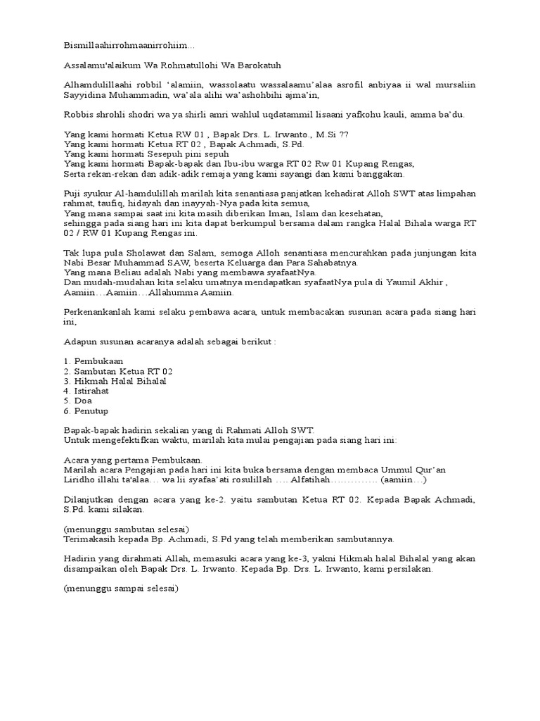 Contoh kata sambutan halal bihalal assalamualaikum wr. Contoh surat undangan resmi untuk halal bihalal yang umumnya diadakan dengan mengundang orang lain melalui surat undangan resmi. Pidato kata sambutan dalam acara halal bihalal 1434 h pidato kata sambutan bapak ketua masjid nurul kirom. Puji dan syukur marilah kita kirimkan kehadirat allah swt tuhan pencipta dan pemilahara alam. Bapak bapak dan ibu ibu yang kami hormati hadirin dan hadirat yang berbahagia assalamualaikum warahmatullahi wabarakatuh. Itu dia gan contoh sambutan atau susunan acara dalam rangka pengajian halal bihalal memang sangat simpel sekali karena memang ini pengalaman pertama saya dalam membawakan acara halal bihalal sengaja saya tulis disini supaya bisa bermanfaat buat temen temen semua dan alangkah baiknya agar di persiapkan jauh jauh hari supaya acara berjalan dengan baik dan lancar.