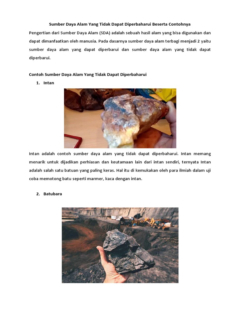 Sementara sda yang tidak dapat diperbarui adalah sda yang jika secara terus menerus manusia menggunakannya tidak membatasi penggunaan sumber daya tersebut. Ada 2 jenis sumber daya alam yakni yang dapat diperbaharui dan yang tidak dapat diperbaharui. Pengertian sumber daya alam yang dapat diperbaharui. Contoh sumber daya alam yang dapat diperbaharui dan tidak dapat diperbaharui serta manfaatnya juga upaya pelestariannya. Proses terciptanya batubara berawal mula dari sisa sisa tumbuhan yang berbentuk gambut lalu mengendap di suatu tempat. Sda yang dapat diperbaharui bisa digunakan terus menerus dan tidak akan pernah habis sedangkan sda yang tidak dapat diperbaharui jumlahnya terbatas dan bisa saja habis jika dipakai terus menerus.