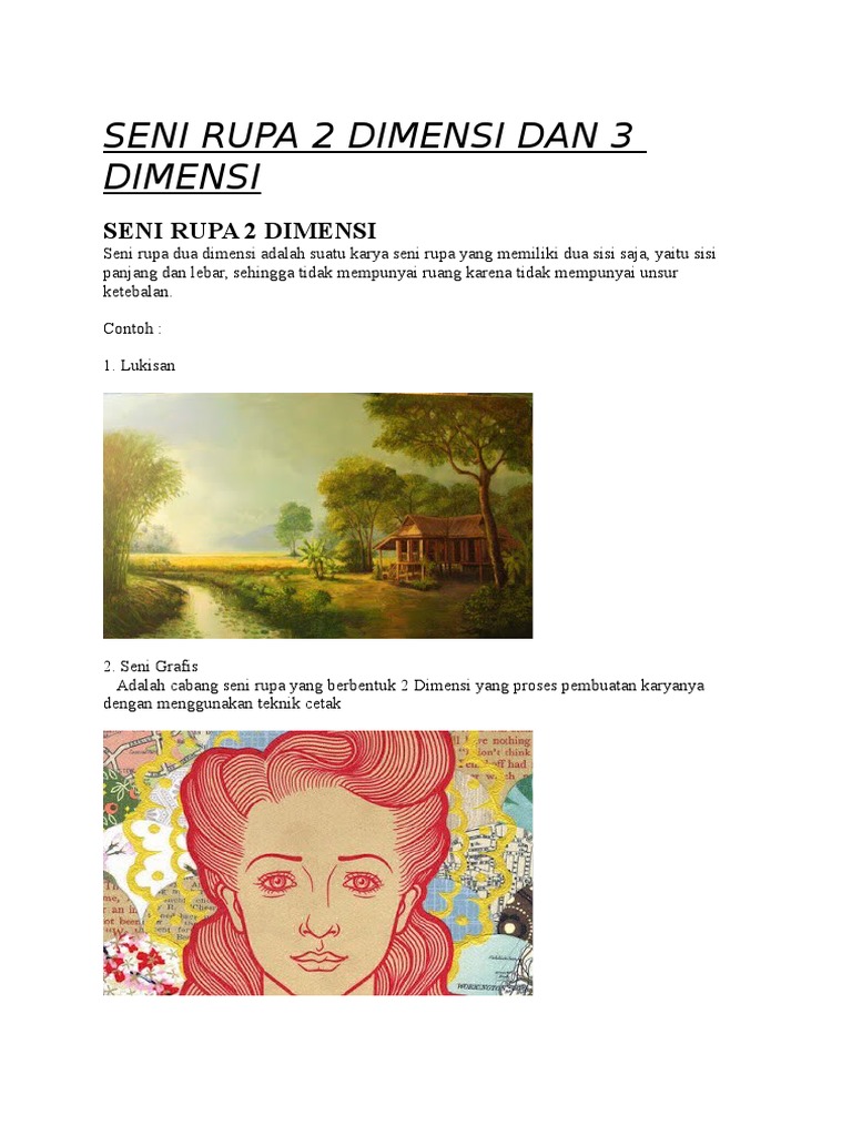 12 contoh karya seni rupa 2 dimensi dan penjelasan lengkapnya karya seni rupa berdasarkan dimensinya dibagi menjadi dua yaitu karya seni rupa 2 dimensi yang mempunyai dua ukuran dan karya seni rupa 3 dimensi yang mempunyai tiga ukuran atau memiliki ruang. Kami tidak hanya menyajikan contoh seni rupa 2 dimensi melainkan juga dengan contoh seni rupa 3 dimensi.