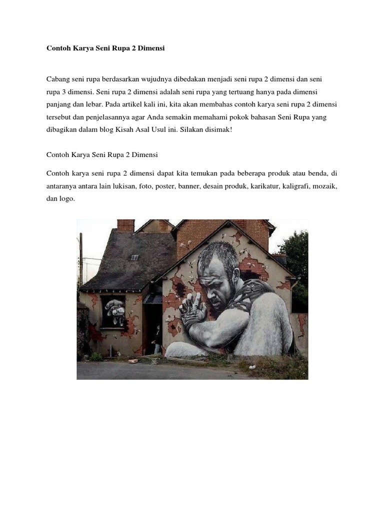 Contoh seni rupa 2 dimensi dan penjelasannya. Contoh seni rupa 2 dimensi dan 3 dimensi setelah pada kesempatan terdahulu kita pernah mengulas tentang prinsip seni rupa dan gambarnya kali ini giliran contoh seni rupa yang akan kami sajikan. Contoh karya seni rupa 2 dimensi dan penjelasannya karya seni rupa 2 dimensi adalah karya seni yang bentuknya memiliki ukuran panjang dan lebar sehingga karya seni rupa dua dimensi hanya bisa dinikmati dari satu sisi saja yaitu depan. Seni rupa 2 dimensi atau yang biasa disebut dengan istilah dwimatra adalah suatu hasil dari karya seni yang terbentuk dari dua unsur saja. Sebuah karya seni yang indah tentu bisa membuat perasaan senang dan merubah mood seseorang yang tadinya bosan jadi bersemangat. Sebagai contohnya adalah hasil hasil karya seni rupa 2 dimensi yang mempunyai nilai artistik yang sangat tinggi. Karya seni rupa 2 dimensi ini tidak mempunyai volume atau ruang karena tidak memiliki unsur ketebalan atau tinggi.