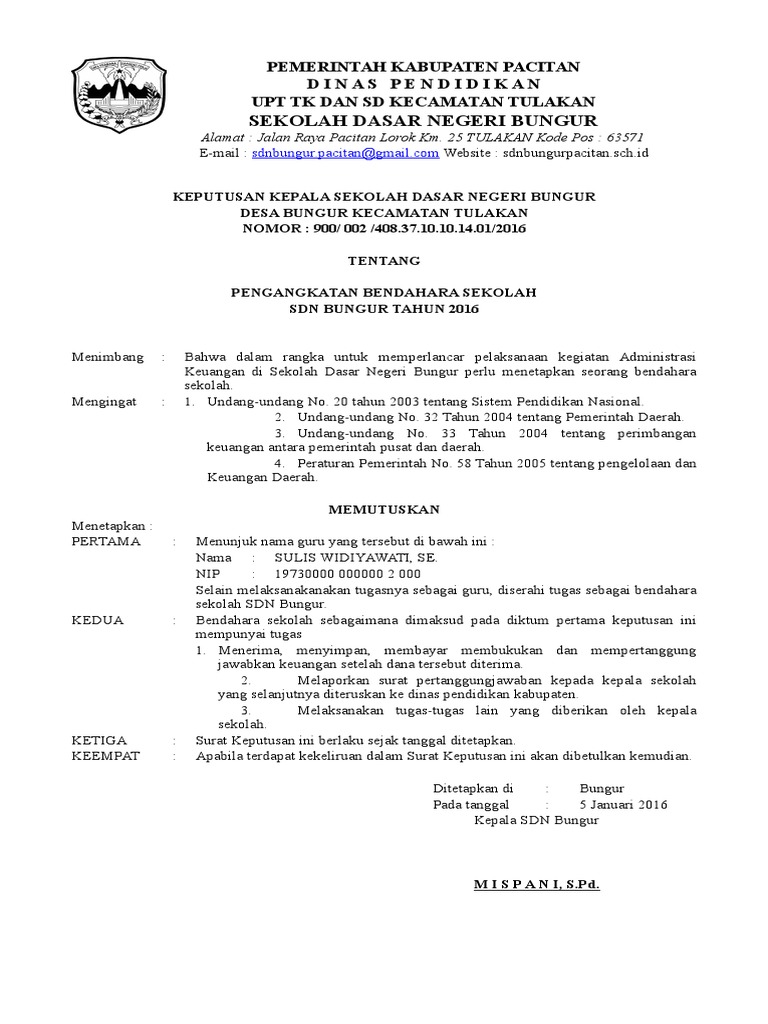 Contoh sk bendahara sekolah yayasan yang bisa bapakibu gunakan dan diunduh secara gratis dengan menekan tombol download biru dibawah ini. Bahwa saat ini sudah diatur juga dalam juknis bos untuk honor seorang bendahara bos yang jumlahnya sekitar rp250000 ini merupakan honorarium untuk bendahara bos di daerah kami. Contoh sk tata usaha sekolah dasar. Surat keputusan adalah sebagai wakil pimpinan kepala sekolah yang berisi pernyataan memutuskan sesuatu hal yang berhubungan dengan tertib organisasi yang bersangkutan. Sk pengangkatan wakil kepala sekolah 2014docx. Dan khusus dalam posting artikel ini adalah tentang contoh sk bendahara bos dari kepala sekolah dalam bentuk ms.