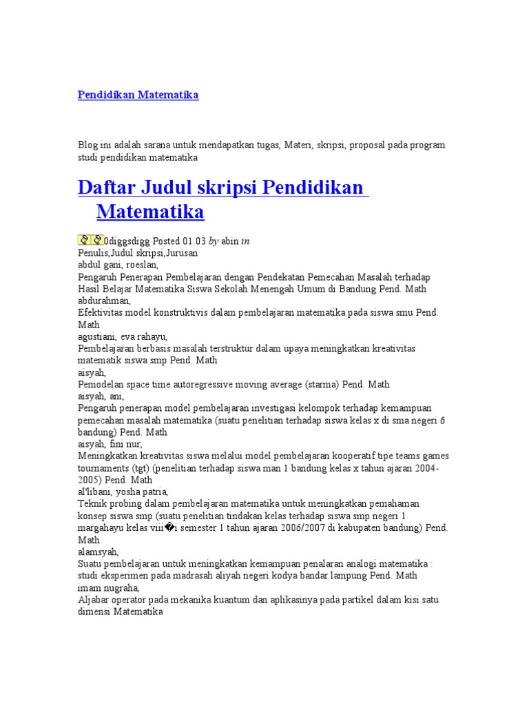 Matematika adalah jurusan yang termasuk dalam jurusan eksakta jurusan ini jika dilalui dengan masuk sbmptn menjadi pilihan jurusan yang sintek. Judul skripsi pendidikan matematika untuk mendapatkan file lengkap dalam bentuk ms word mulai bab 1 sd. Klik di sini untuk informasi file lengkap proposal skripsi kualitatif pendidikan matematika pdf selengkapnya. Matematika adalah suatu ilmu pasti atau eksak yang mempunyai rumus rumus dalam penyelesaiannya. Jurusan matematika terdiri dari dua jenis yaitu matematika murni dan jurusan matematika pendidikan. Contoh skripsi pendidikan matematika contoh skripsi pendidikan matematika.