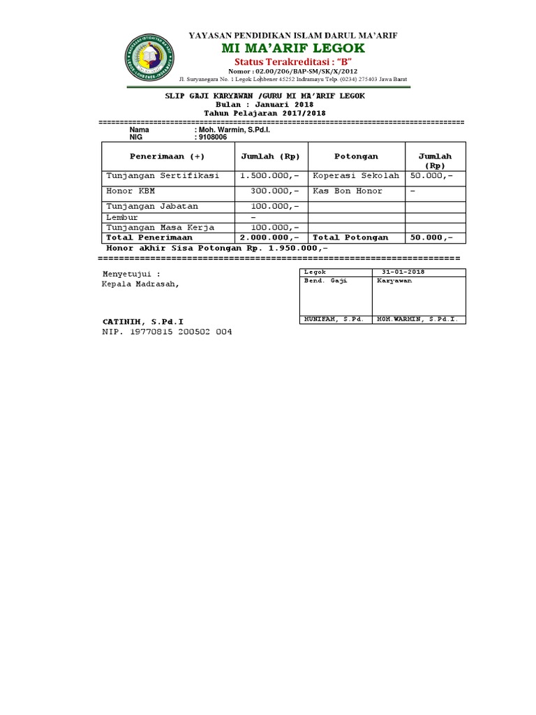 Bahkan tidak jarang slip gaji ini akan ditunggu tunggu kedatangannya karena bersamaan dengan cairnya uang gaji atas kerja keras selama sebulan di tempat kerja. Dalam hal ini karena guru honorer sudah ditanggung gajinya oleh pemerintah setempat. Komponen slip gaji guru honorer tidak jauh berbeda dengan slip gaji guru tetap hanya sedikit berbeda pada rinciannya. Ada banyak contoh slip gaji karyawan yang bisa anda temukan di internet untuk dijadikan referensi bila perusahaan anda ingin membuat format slip gaji yang baru. Slip gaji yang akan didapatkannya pun akan berstempel yayasan dengan kop yayasan pula. Utari ida oesman 28082017 25122018.