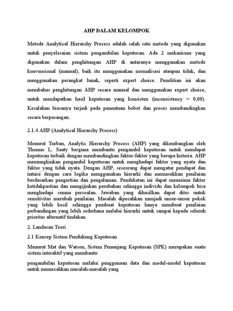 Metode pairwise comparison ahp mempunyai kemampuan untuk memecahkan masalah yang diteliti multi obyek dan multi kriteria yang berdasar pada perbandingan preferensi dari tiap elemen dalam hierarkijadi model ini merupakan model yang komperehensif. Analytical hierarchy process ahp. Kemungkinan anda sudah pernah mendengar ahp atau analytic hierarchy process. Metode ini adalah sebuah kerangka untuk mengambil keputusan dengan efektif atas persoalan yang kompleks dengan menyederhanakan dan mempercepat proses pengambilan keputusan dengan memecahkan persoalan tersebut kedalam bagian bagiannya menata bagian atau variabel ini dalam suatu susunan hirarki member nilai numerik pada. Selanjutnya anda juga harus mengetahui beberapa rumus yang digunakan pada perhitungan metode ahp. Ahp merupakan salah satu alat bantu proses dalam pengambilan keputusan yang dikembangkan oleh thomas l saaty pada tahuhn 70an.