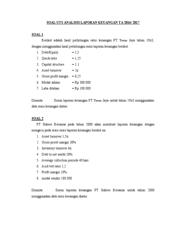 Contoh soal analisis laporan keuangan dan jawabannya. Berikut ini adalah kisi kisi soal pretest ppg 2018 yang merupakan kumpulan file dari berbagi sumber kisi kisippg tentang contoh soal analisis laporan keuangan dan jawabannya bsi yang bisa bapakibu gunakan dan diunduh secara gratis dengan menekan tombol download biru dibawah ini. Contoh soal analisis laporan keuangan 3. Rasio yang dihitung dengan cara membagi total aset lancar dengan total kewajiban lancar adalah. Dibawah ini yang merupakan tujuan menganalisis laporan keuangan adalah a. Dibawah ini adalah tugas tugas yang dilakukan perantara keuangan atas nama pemakai laporan keuangan kecuali a. Rasio modal kerja c.